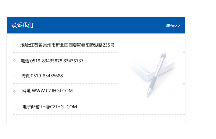 傳真:0519-83435688    郵編:213135    網址:WWW.czjhgj_com.11500l.com    電子郵箱:JH@czjhgj_com.11500l.com